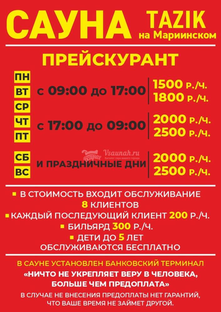 Пн-Пт с 09-00 до 17-00 стоимость 1800 руб/час с одной парилкой и 2200 руб/час с 2-мя парилками!